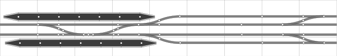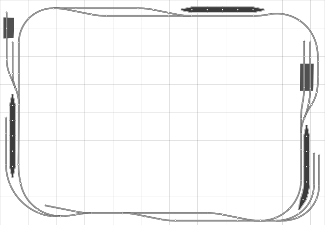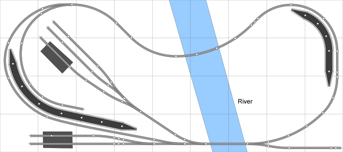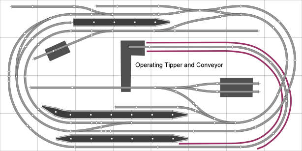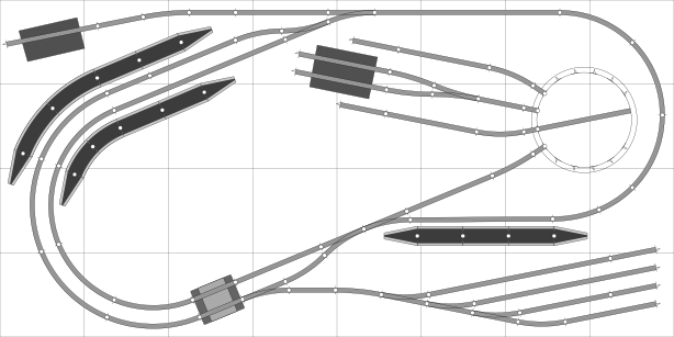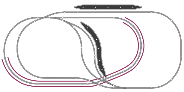 Many of the plans are designed using first radius curves and may not be suitable for modern rolling stock. However, it is possible to adapt many of them for second and third radius curves if you have more space. In addition, some pieces of flexitrack have been employed to ensure an exact fit of track pieces. Elevated sections are shown with purple edges, reverse loops in blue. All buildings and platforms are in dark grey, whilst the grid represents a square foot.